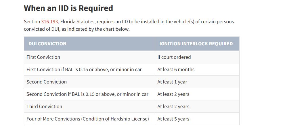 Section 316.193, Florida Statutes, states that ignition interlock devices must be installed on the vehicle of certain persons convicted of DUI. The driver must blow into the device before they can start their vehicle. If the driver blows above a certain breath alcohol threshold the vehicle will not start. This lock out will result in a violation.